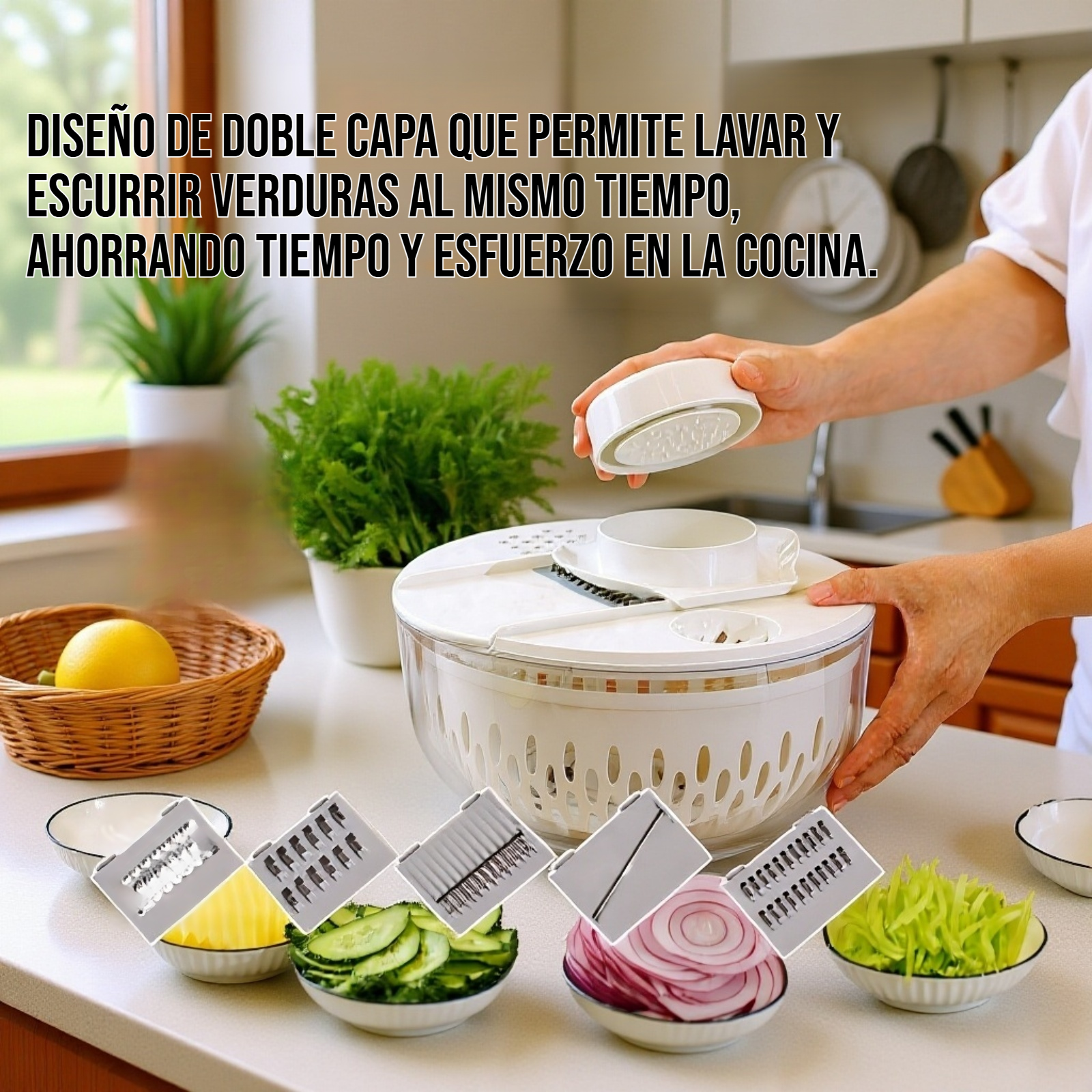 Diseño de doble capa que permite lavar y escurrir verduras al mismo tiempo, ahorrando tiempo y esfuerzo en la cocina.